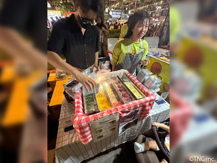 2025年2月1日から、プノンペンの王宮近くのリバーサイドエリアが週末の夕方限定で歩行者天国となった。市内で遊べる場所があまりないことと、週末に地方の田舎に帰らない若者層をターゲットに飲食やクラフト品の販売や、ライブなどの催し物を行っている。歩行者天国が始まると周辺の駐車場や駐輪場はどこもいっぱいで、道路も隙間がないほどの人が歩いている状況だ。道路の両サイドには数え切れないほどの屋台が並んでおりデザートの屋台も多い。これまでの伝統的な甘味に加え、ティラミスの屋台も複数並ぶようになった。ティラミス店の前には若者の人だかりができるほどの人気となっている。