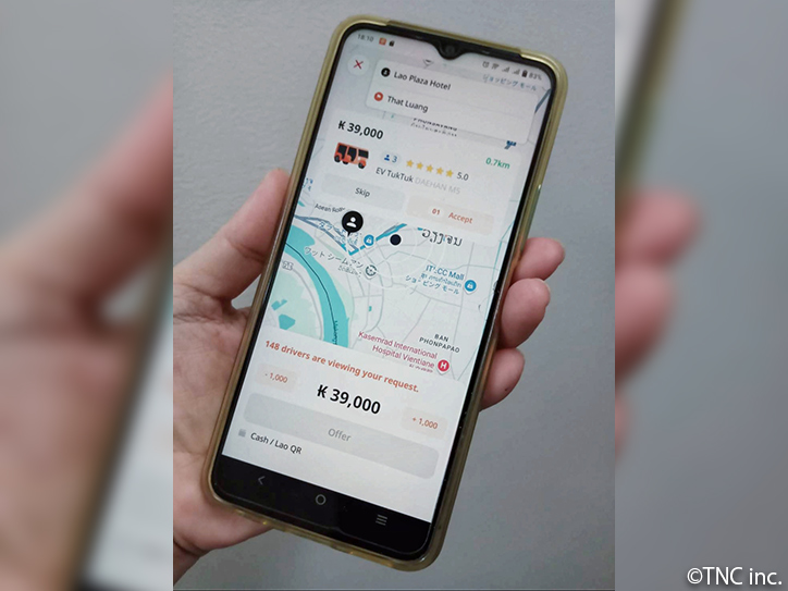 首都ビエンチャンでは、EVトゥクトゥクを利用したタクシーサービス「Kokkok MOVE」が人気となっている。その一番の理由は利用料金の安さになり、専用のモバイルアプリで配車でき、乗り場と行先、希望の料金を入力すると、サービス可能な複数のドライバーから料金プランが提案され、その中から乗客が自分に合ったプランを選べるという仕組みだ。そのため配車アプリを利用したタクシーや一般のトゥクトゥクよりも割安で利用できる。たとえば2キロの距離で通常のトゥクトゥクを利用する場合、交渉しても20,000〜30,000kip(約130~約200円)ほどかかるが、Kokkok MOVEでは価格交渉の必要もなく6,000kip(約40円)ほどと半額以下の料金で利用できる。カード・現金共に支払いが可能。アプリのダウンロード数は既にAndroid版で10万を超えている。