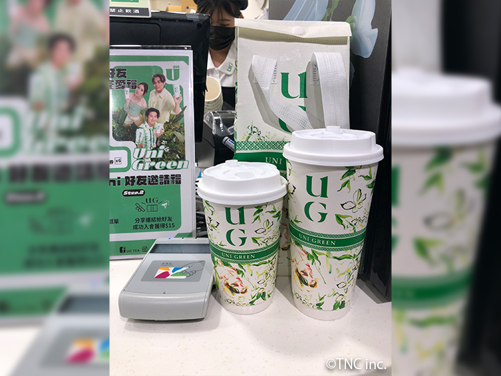 また、Z世代に人気の3人組音楽ユニット「告五人(ガオウーレン) Accusefive」をイメージモデルに起用、ヒット曲「你要不要吃哈密瓜(メロン食べない?)」をイメージしたメロンミルクティ「哈瓜奶茶(ハーミーナイチャ/75元)」を期間限定で販売し話題となっている。ここ2、3年ほど台湾では台湾茶をブレンドしたアルコールドリンクがブームとなっているが、「UG TEA」もジャスミンティー+ワインの「十五茉微醺」を店舗で提供し、これもヒットしている。Z世代からはおしゃれなパッケージが人気があるほか「AIを使用している点が今までにないドリンクショップだし、味も良いので気に入っている」と好評。