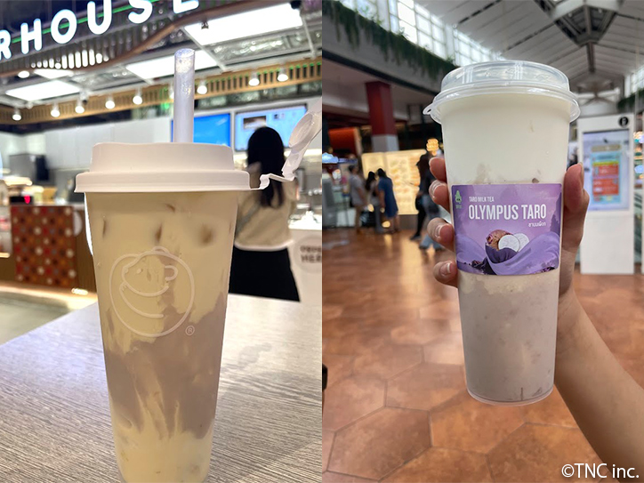 2024年の年末ごろからタロイモ・モチ・ミルクティーがトレンドドリンクとして注目されている。2024年11月にミルクティー店「GAGA」が開店6周年記念に「Mochi Taro Milk Tea(Mサイズ125バーツ、約573円)」と「Mochi Taro Frappe(Mサイズ145バーツ、約665円)」を発売。紫色のタロイモペーストとドロっとしたモチに、ミルクティーやタロイモシェイクを合わせた新しいテイストのドリンク。当初は2024年12月末までの期間限定だったが、人気を受けて2025年に入り再販売されている。このほか2025年は多くの人気ミルクティー店で類似のタロイモとモチのミルクティーが発売されている。チーズクリームトッピングが特徴のミルクティー店「Nose Tea」は2025年5月タロイモペースト入りの「Olympus Taro Signature(160バーツ、約733円)」を発売。「Bear House」は2025年6月、”mochi to the moon”メニューをスタート。タイ産米のモチとタロイモペースト入りの「Moon Mochi Fresh Taro Milk Tea(139バーツ、約637円)」などがある。