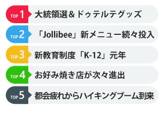 6年ぶりに大統領選挙が行われ、過激な発言で話題になった元ダバオ市長のドゥテルテ氏が圧勝。習近平国家主席、オバマ大統領、安倍首相との会談など、外交でも注目を集めました。新たな教育制度「K-12」もスタートし、多くの変化が起こる予兆を感じる1年となった、フィリピンの2016年のトレンドランキングを紹介します。