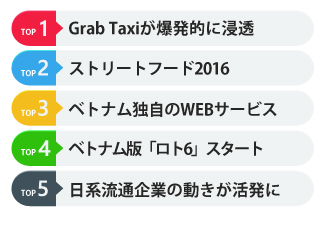 世界中で増加している配車アプリだが、ベトナムでも2014年にマレーシア発の「Grab」とアメリカ発の「Uber」の配信がスタートした。タクシーに関しては両社のシェアは拮抗しているが、Grabが2014年末にリリースしたバイクタクシー配車アプリ「Grab Bike」が2016年、急速に利用者数を伸ばし、既存のバイクタクシーである「Xe om(セオム)」をも圧倒している。Grab Taxiとは異なり、Grab Bikeは運転手にGrabとひと目で分かるグリーンのジャケットとヘルメットを着させることによって、PR効果も生んでいる。街中で信号待ちをしていると、4~5台は目に入るほどドライバーの数も増加している。Grab Bikeは乗車前に価格が決まっているため値段交渉の必要がなく、1km当たりおよそ5,000ドン(約25円)と、従来のタクシーの3分の1程度と安い(時間帯や混雑状況によって多少相場は変動する)。また、運転手には若者が多く、片言でも英語が通じるため外国人利用者にも好評。最近では、後ろに大きなクマのぬいぐるみを乗せて街中を走らせるというプロモーションも行うなど、認知度を高めている。