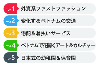 H&Mなどのファストファッションブランドの進出やユニクロの上陸を望む声など、マクドナルドやスターバックスの上陸時も同様だったように、近隣諸国にはあったがベトナムにはなかった小売店、飲食店の進出は熱狂的に受け入れられる。今後も海外企業の進出は続きそうだ。また、5位の日本の文化・躾が幼児教育に導入されるなど、日本のプライオリティは同国で依然高く、日本式の教育を取り入れる教育機関は増えている。中間層の拡大で子どもの教育にお金をかける家庭も増加するだろう。