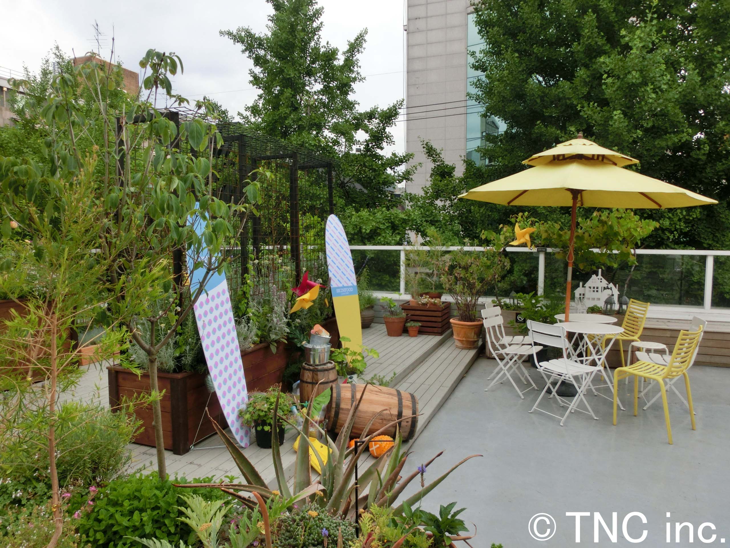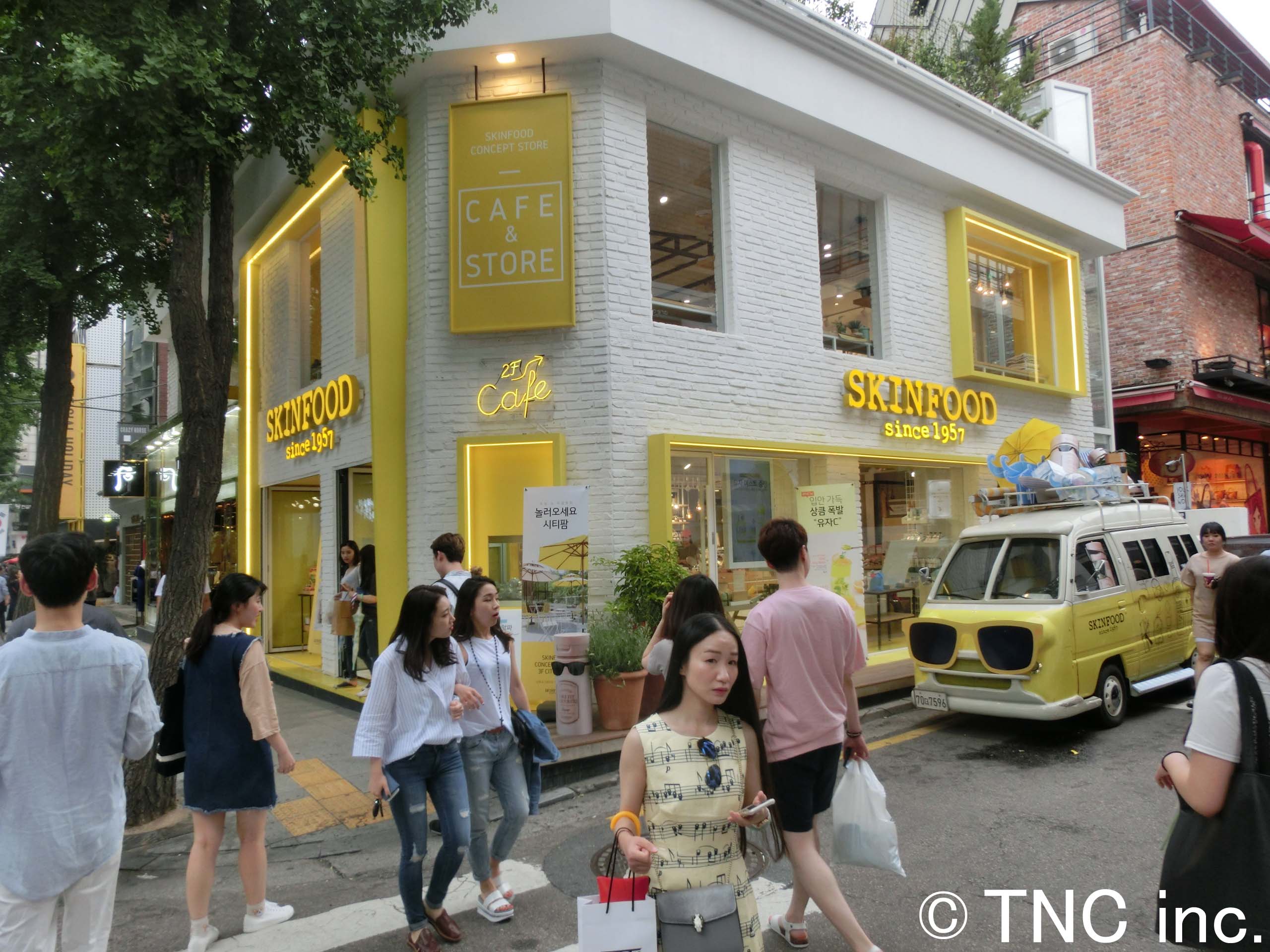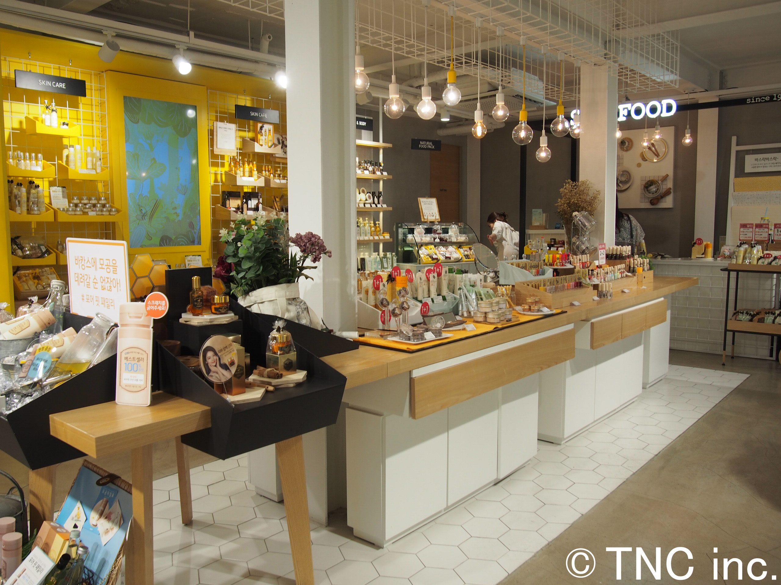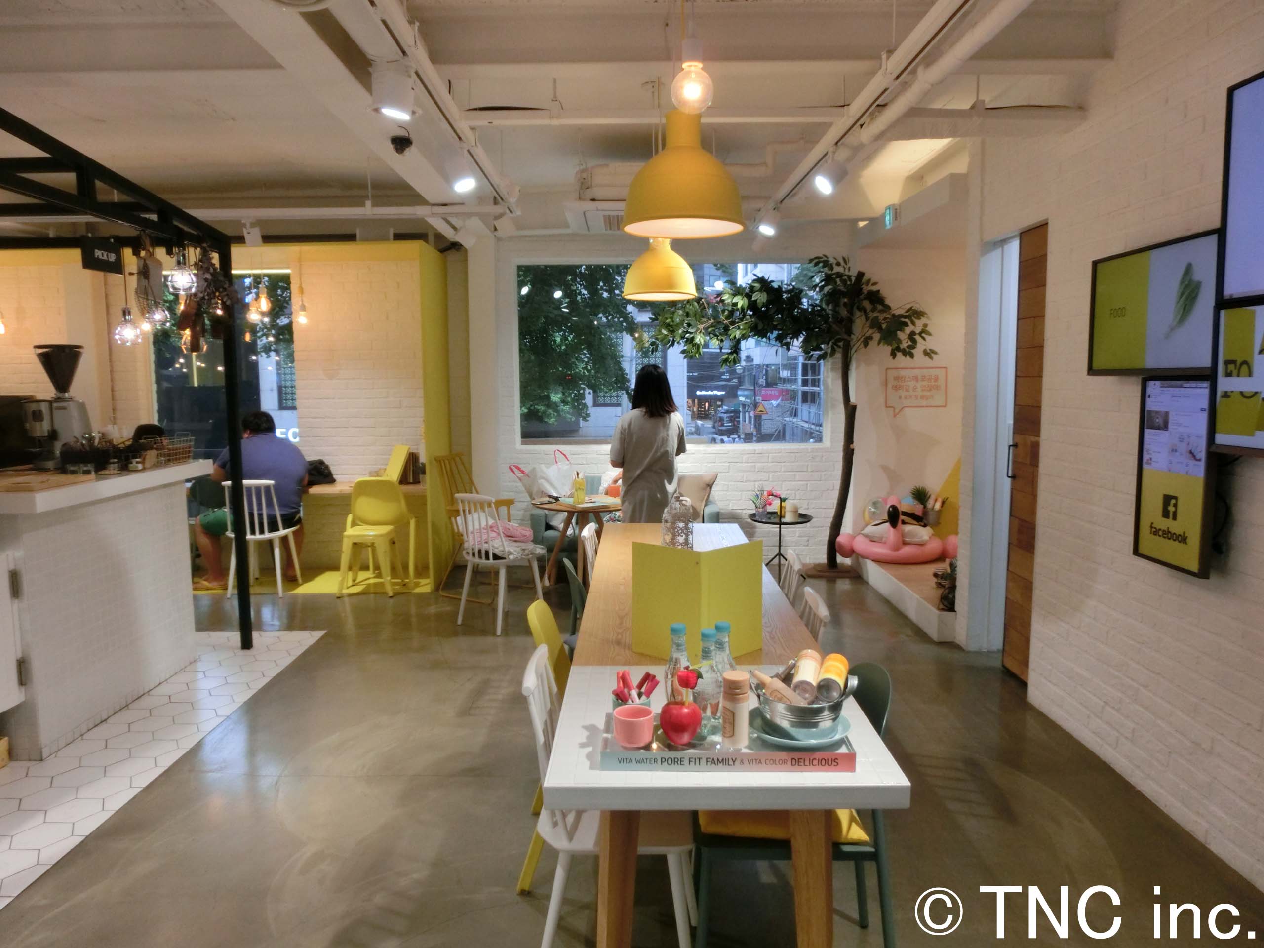 東京でいう表参道のような人気エリア・新沙洞(シンサドン)カロスキルにある、「食」をテーマにした話題のコスメブランド「SKINFOOD」のショップ。1階は通常の商品販売フロアで2階にはカフェスペース、3階には「シティファーム」という都市型農園+テラスフロアとなっています。取材時には1階の販売フロアで「柚子」にフィーチャーしたコスメ商品を推しており、その企画に連動して2階のカフェでは柚子を使ったスイーツ・ドリンクメニューを提供するなど、ショップ全体で「食品+コスメ」というブランドコンセプトが伝わりやすい効果的なブランディングを行っています。