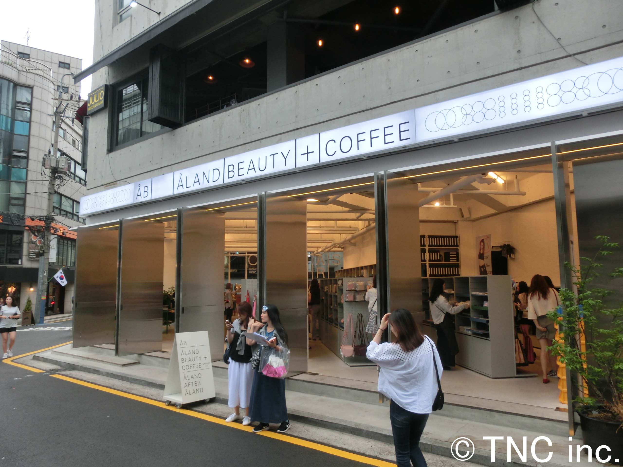 大勢の人でにぎわっているブックカフェ(左)、ハイセンスなセレクトショップ「ALAND」の新業態は「BEAUTY+COFFEE」がコンセプト。コスメや雑貨を中心にそろえたショップには、「DAEROO」というコーヒーショップも入っている(右)