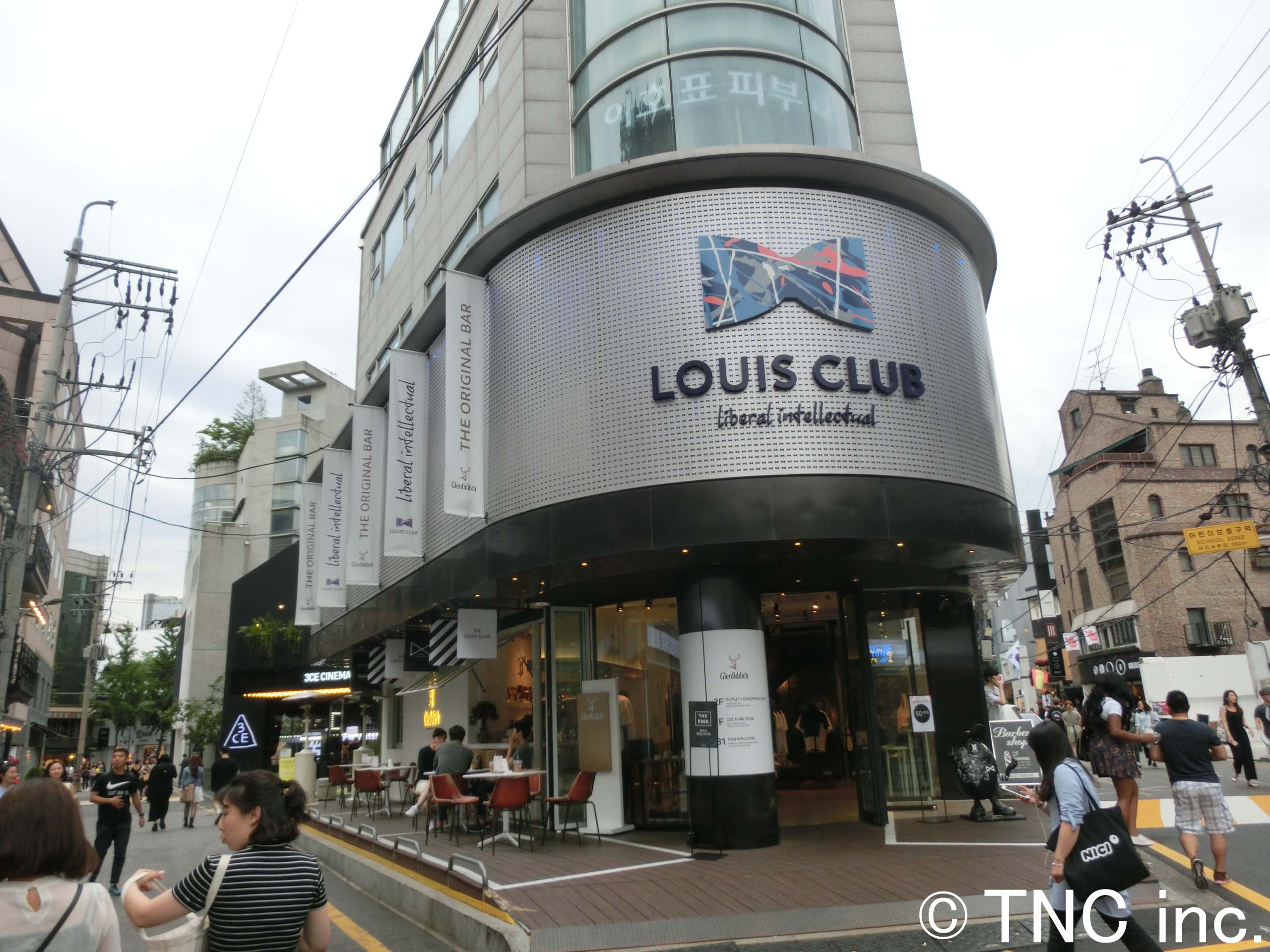 LOUIS CLUBの外観。テラスカフェでくつろぐ男性も(左)、入口で明確にフロアを紹介。Glenfiddichのロゴも大々的にアピール(右)