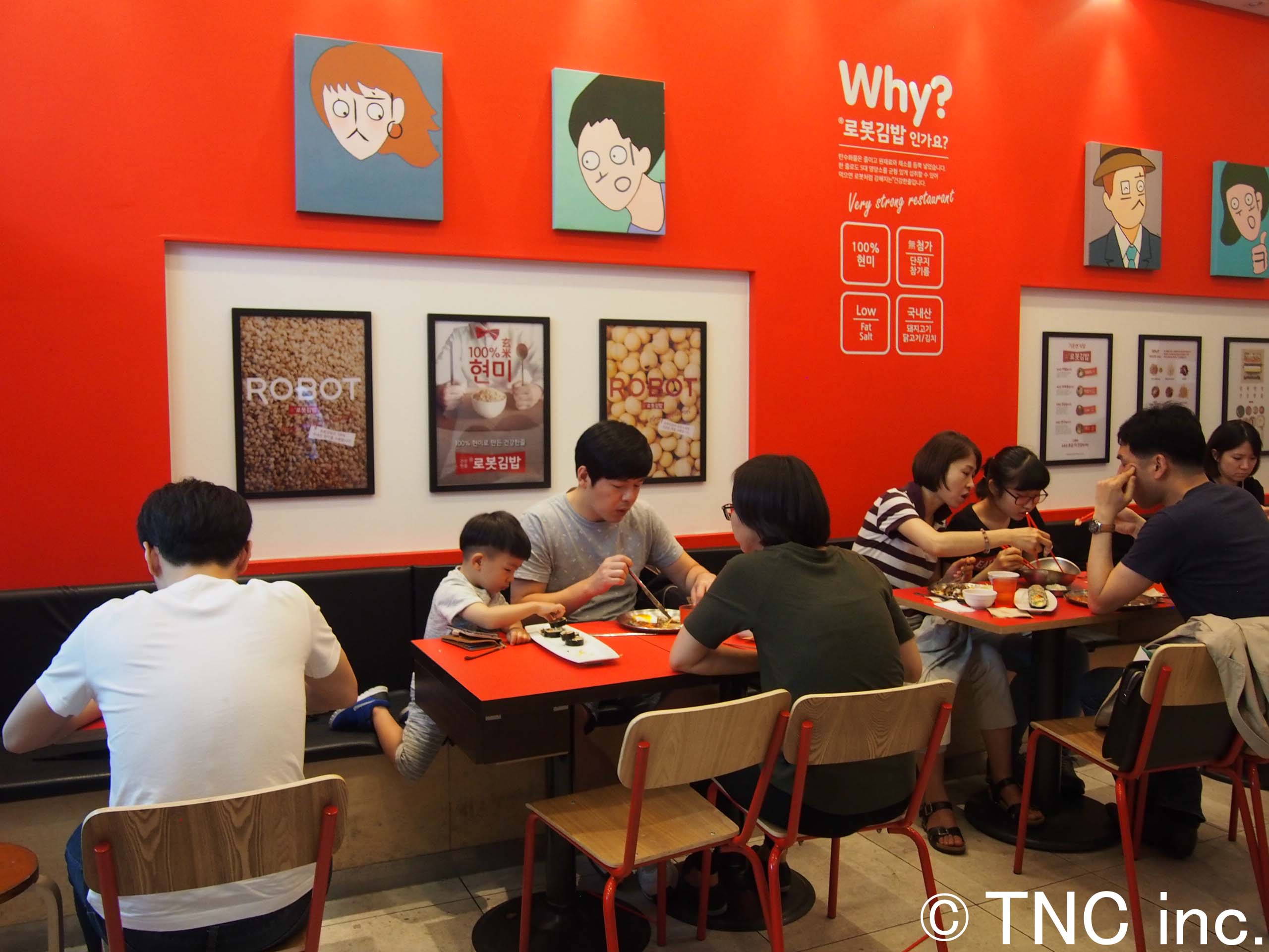 2014年にソウルの中心部・鍾路(チョンノ)にオープンした「食客村(シッケッチョン)」は、大人気のグルメ漫画「食客」に登場する韓国各地の有名店を一箇所に集めたグルメスポット。その中に出店する「ROBOTキンパッ」では韓国の伝統的な海苔巻き「キンパッ」を、よりプレミアムなメニューとして提供しています。この店では使用する食材をオーガニックにしたり、野菜多め、低脂肪、ご飯少なめにアレンジすることが可能となっており、健康を意識する人にとってはうれしいメニュー展開。生わさび、クリームチーズ、ドイツソーセージなど多彩なメニューも人気の秘訣です。