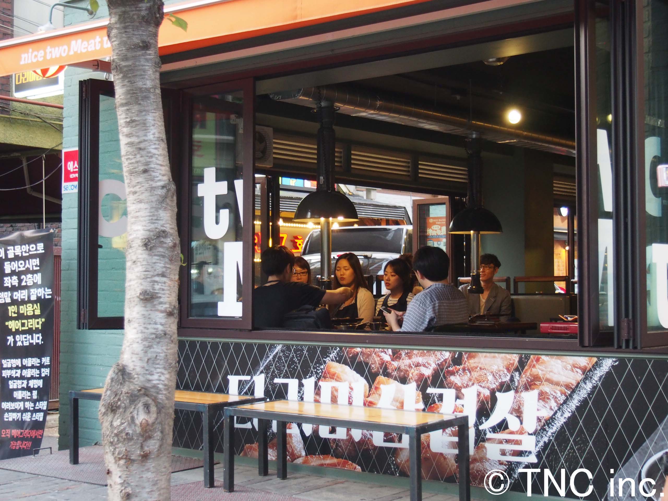 韓国の伝統的な豚バラ焼肉「サムギョプサル」を、新しいスタイルで展開しているのは「nice two Meat u」。独自に開発した鉄板を使用し、重しで押さえて短時間で絶妙に焼き上げるスタイルをとり、開放的でBBQのようなムードを感じさせる店舗デザインも若者に大人気となっています。