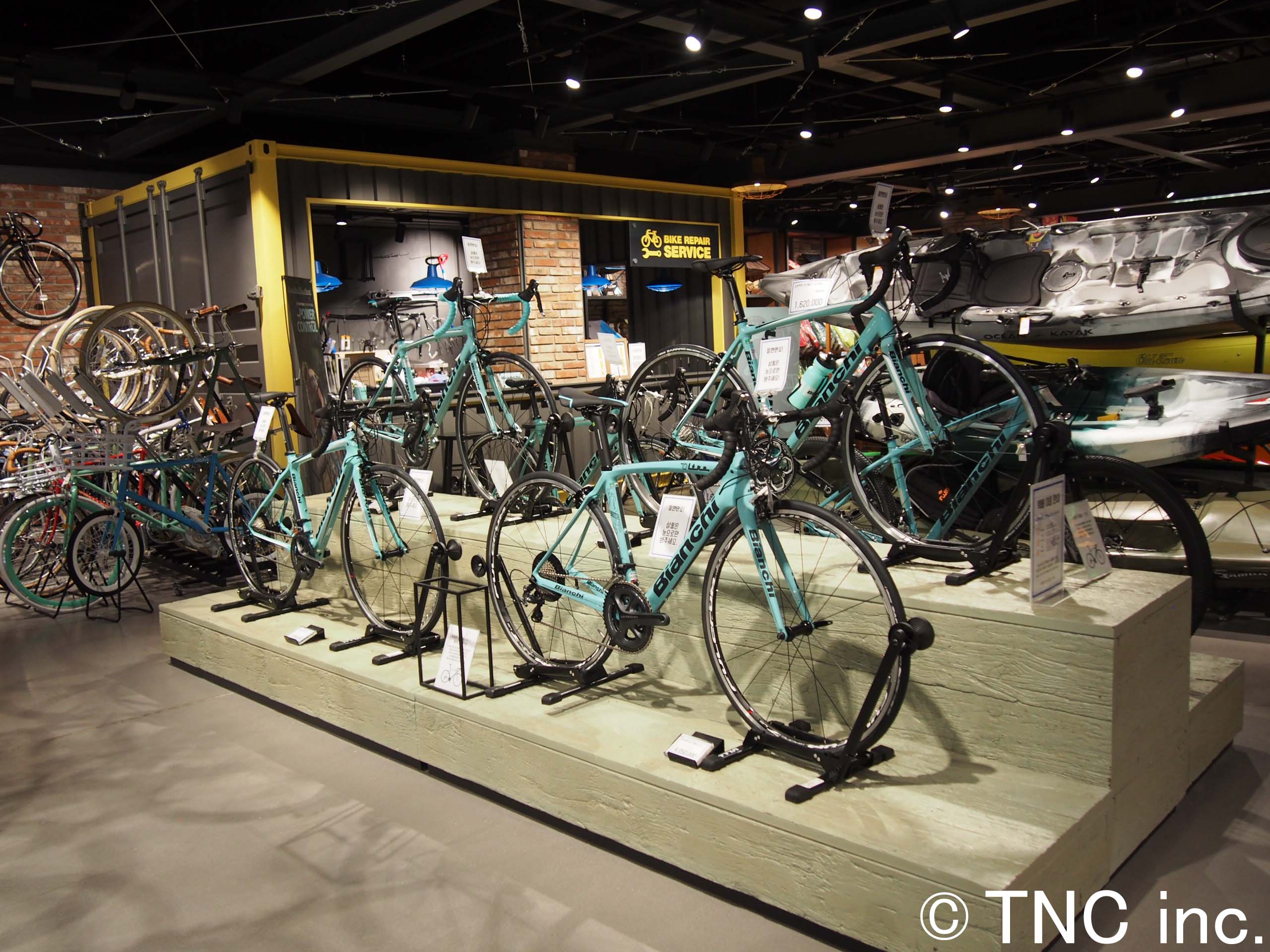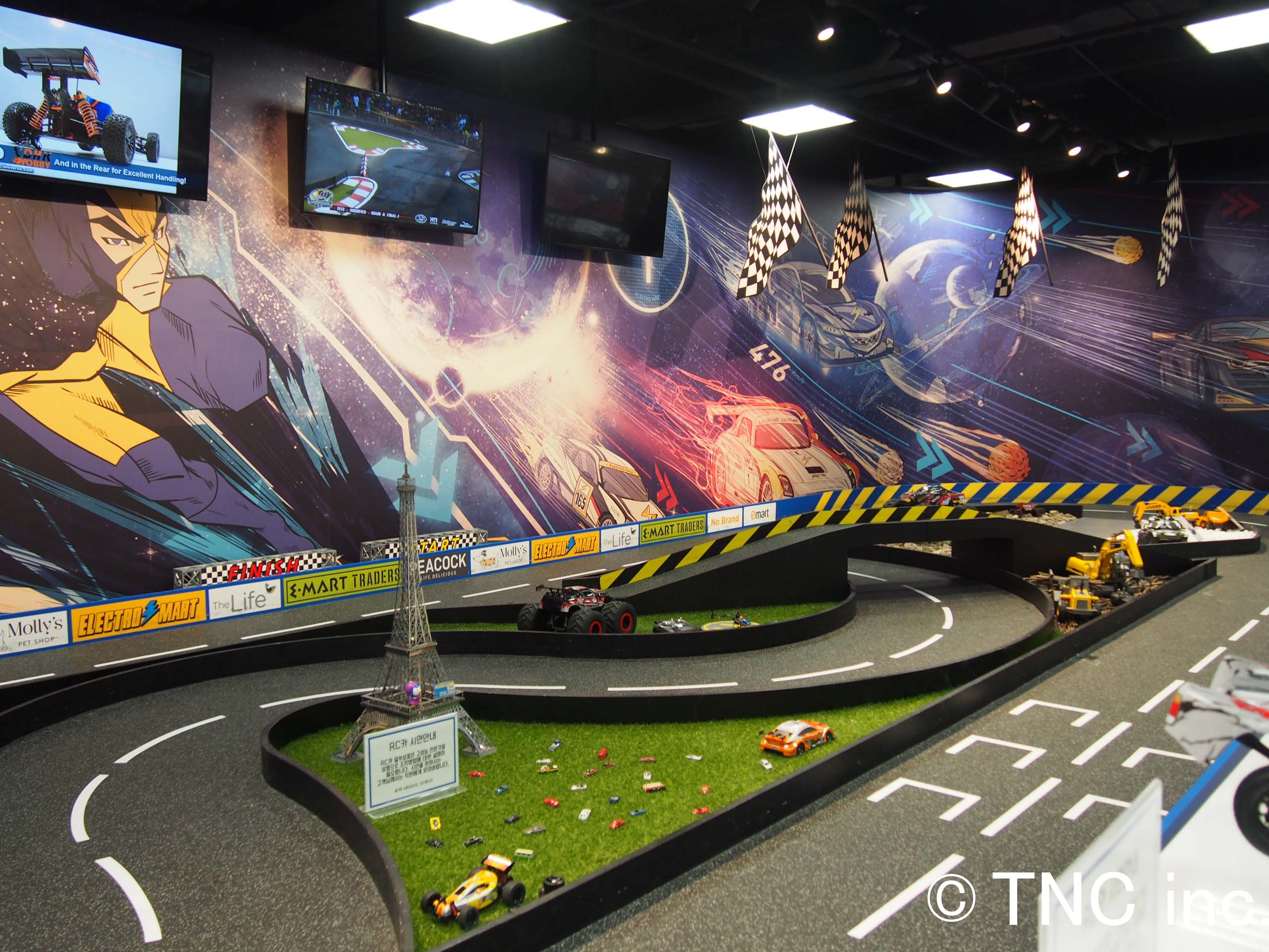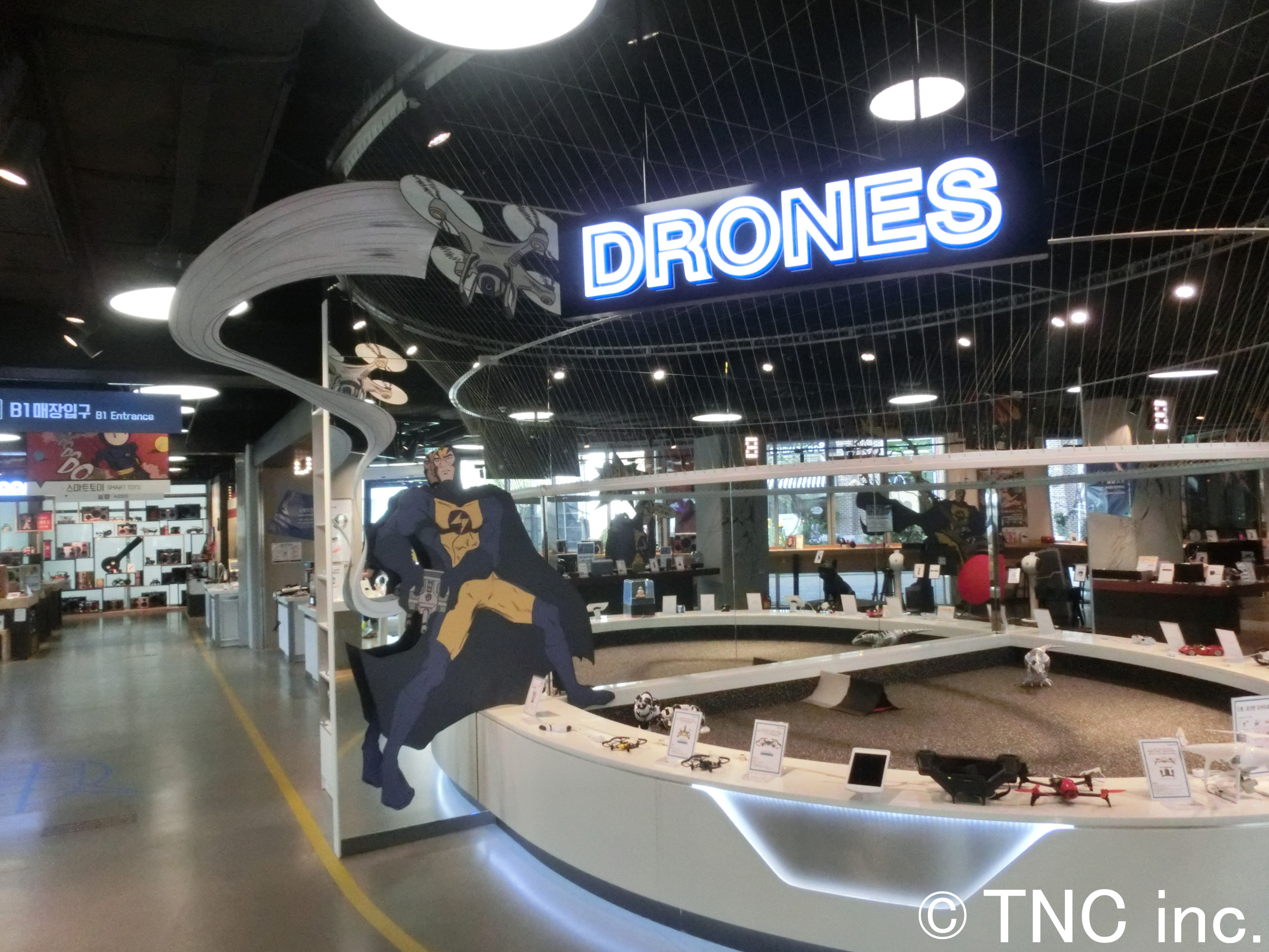 1階は最新のドローンやウェアラブルガジェットなどの商品群が中心(左)、店内にはラジコンカーのレース場も設置されており、この場で楽しむことができる(中央)、家電製品に限らず、流行の最新自転車コーナーなどもあり。父と子のレジャーを意識した品揃え(右)