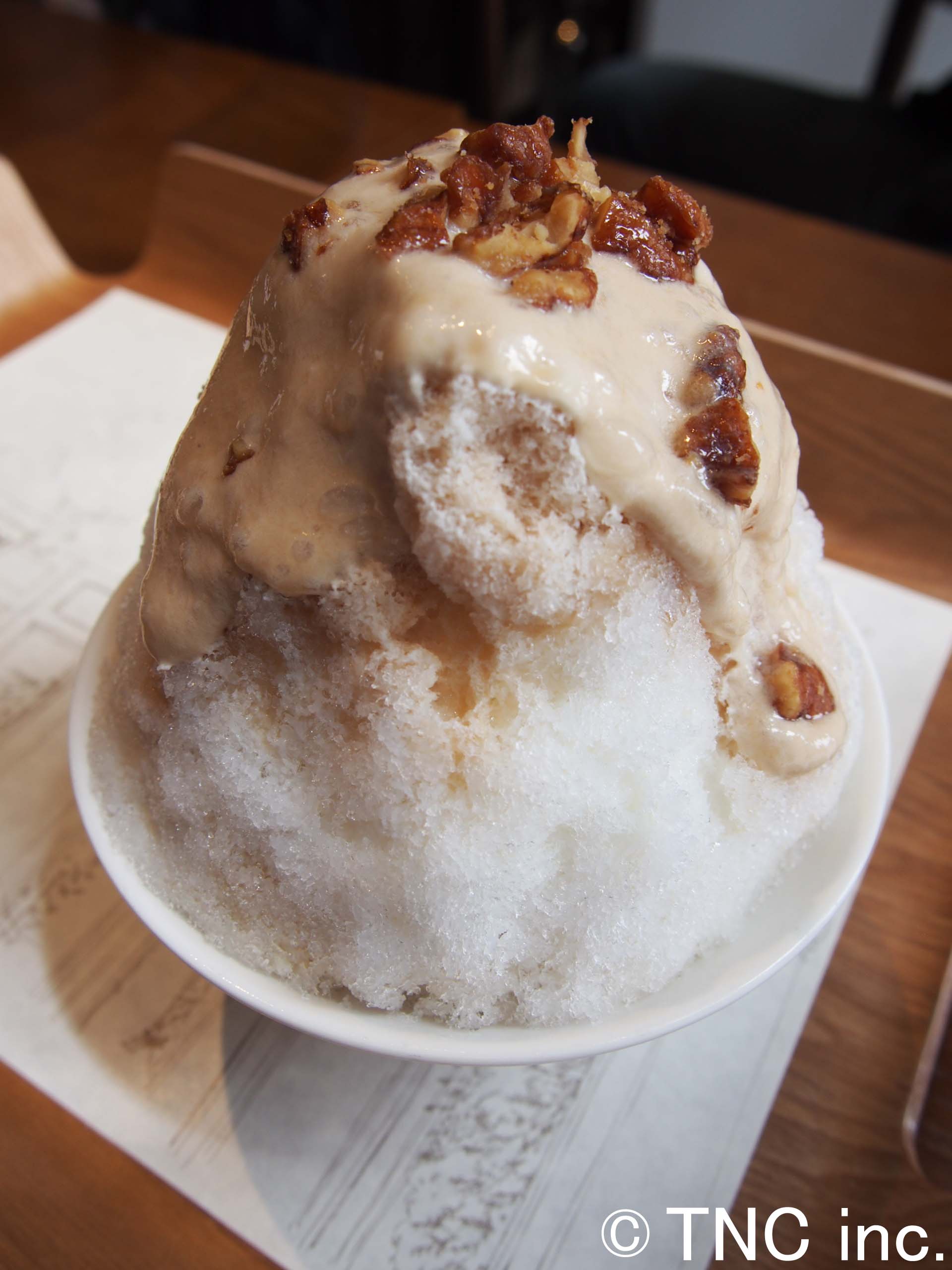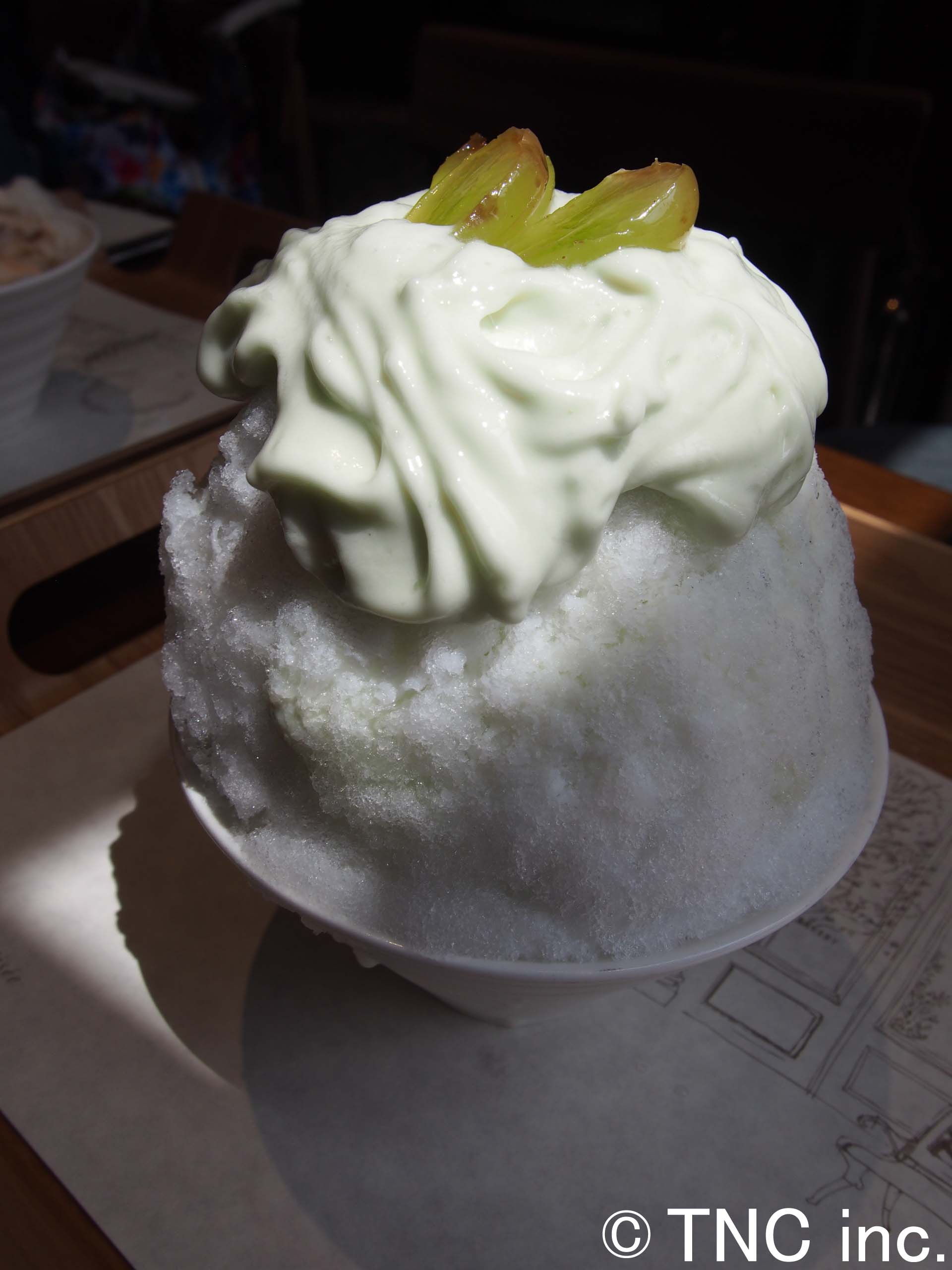 韓国の伝統スイーツである「パッピンス」。かき氷の上にあずきやフルーツ、アイスクリームなどを盛り付けたもので、多くの店で売られています。「Artisee Cafe」のパッピンスは、アールグレイやグリーングレープなど、これまでにない風味で、泡状のクリームが使われ、上にナッツやマスカットを乗せた洗練されたテイスト。いまどきの若者向けにアップデートされています。