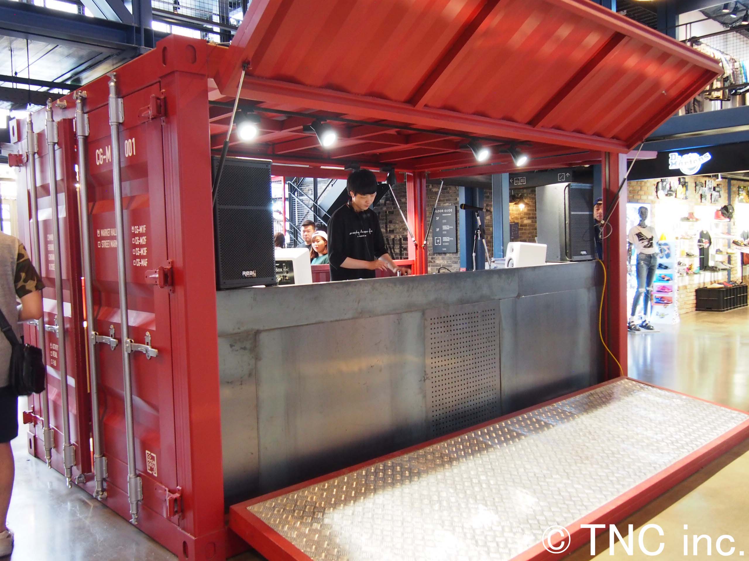 屋外スペースにはアメリカンなフードトラックが出店(左)、店中ではDJによる生演奏が行われている(右)