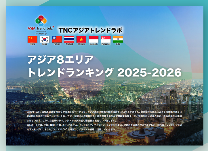 「アジア8エリア トレンドランキング2025–2026」は、株式会社TNCが運営する「TNCアジアトレンドラボ」(https://tnc-trend.jp/)が、中国・韓国・台湾・タイ・ベトナム・インドネシア・フィリピン・インドの8エリアを対象に行った調査をもとに作成しております。